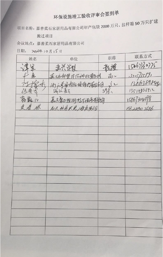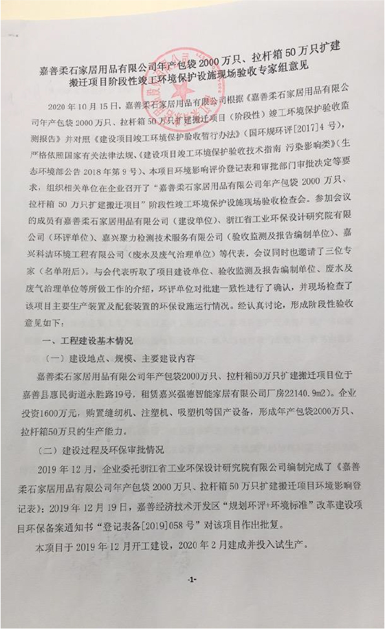 嘉善柔石家具用品有限公司年產包袋2000萬只、拉桿箱50萬只擴建搬遷項目階段性驗收意見