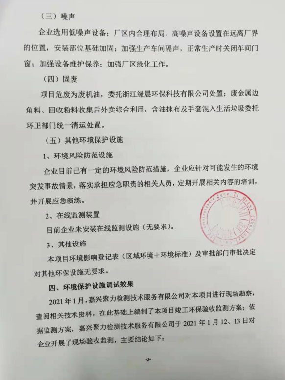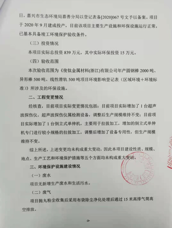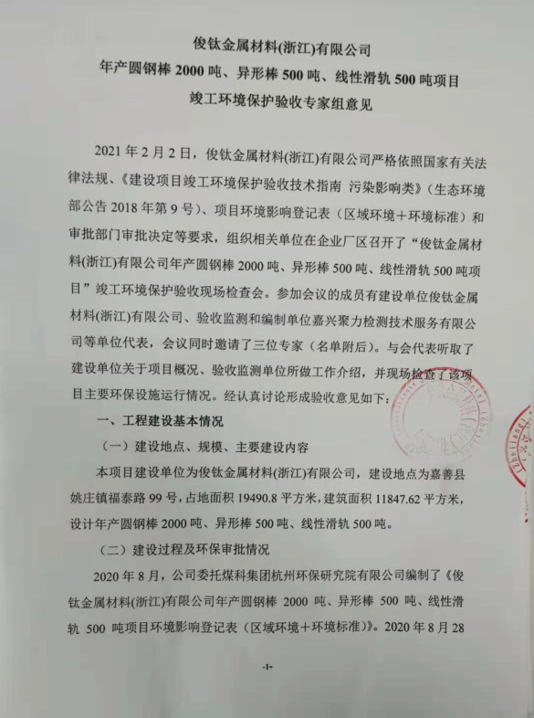 下載附件:俊鈦金屬材料(浙江)有限公司年產(chǎn)圓鋼棒2000噸、異形棒500噸、線性滑軌500噸項目竣工環(huán)境保護驗收監(jiān)測報告
