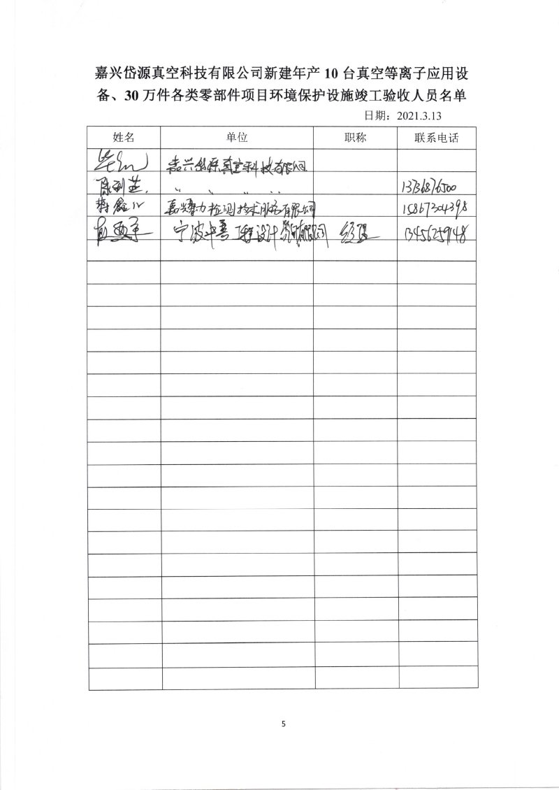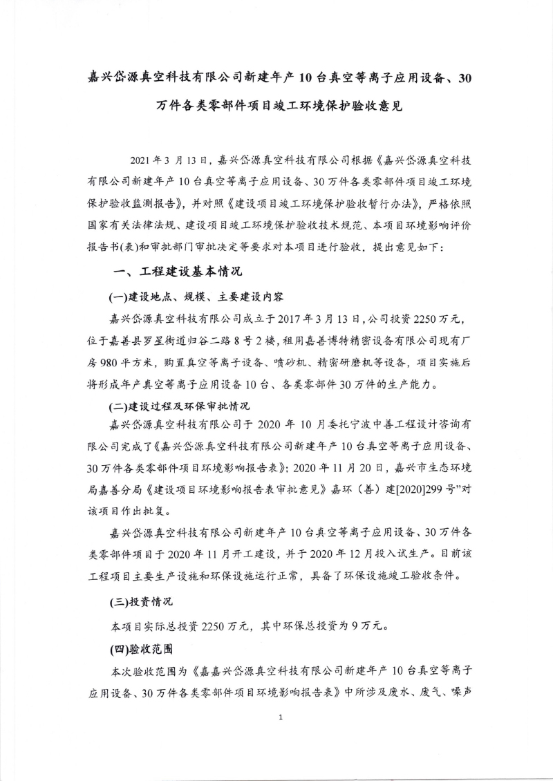 嘉興岱源真空科技有限公司新建年產(chǎn)10臺真空等離子應(yīng)用設(shè)備、30萬件各類零部件項目驗收意見