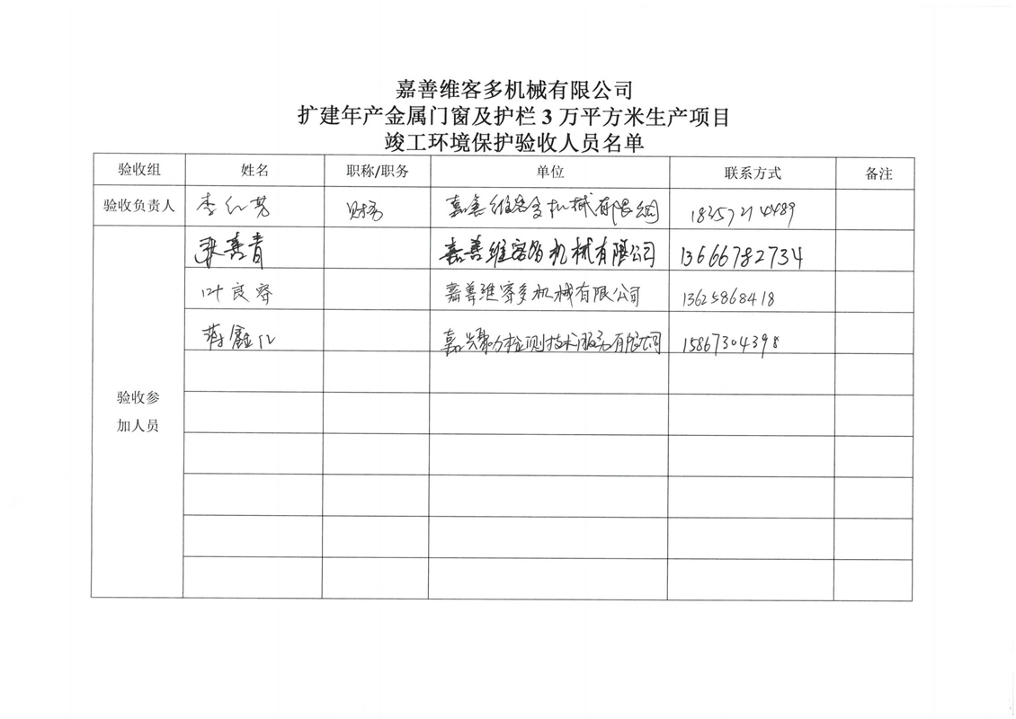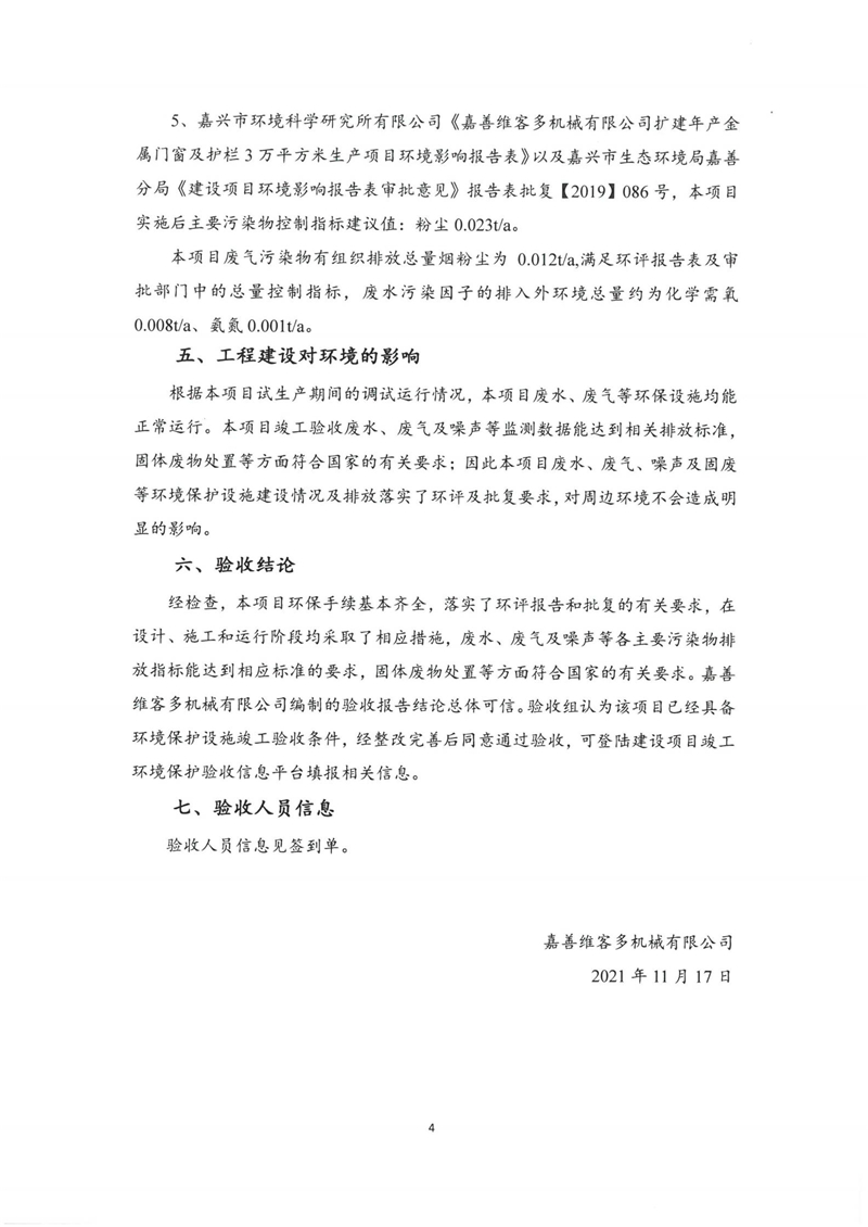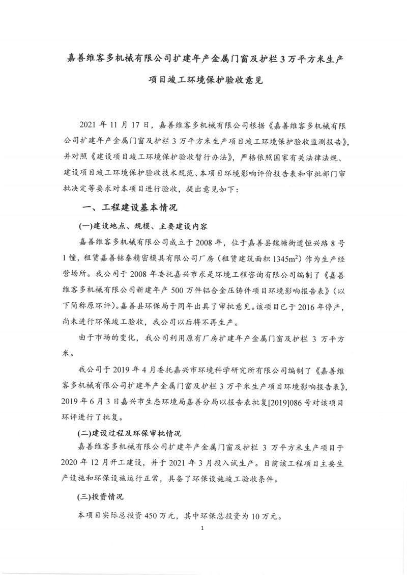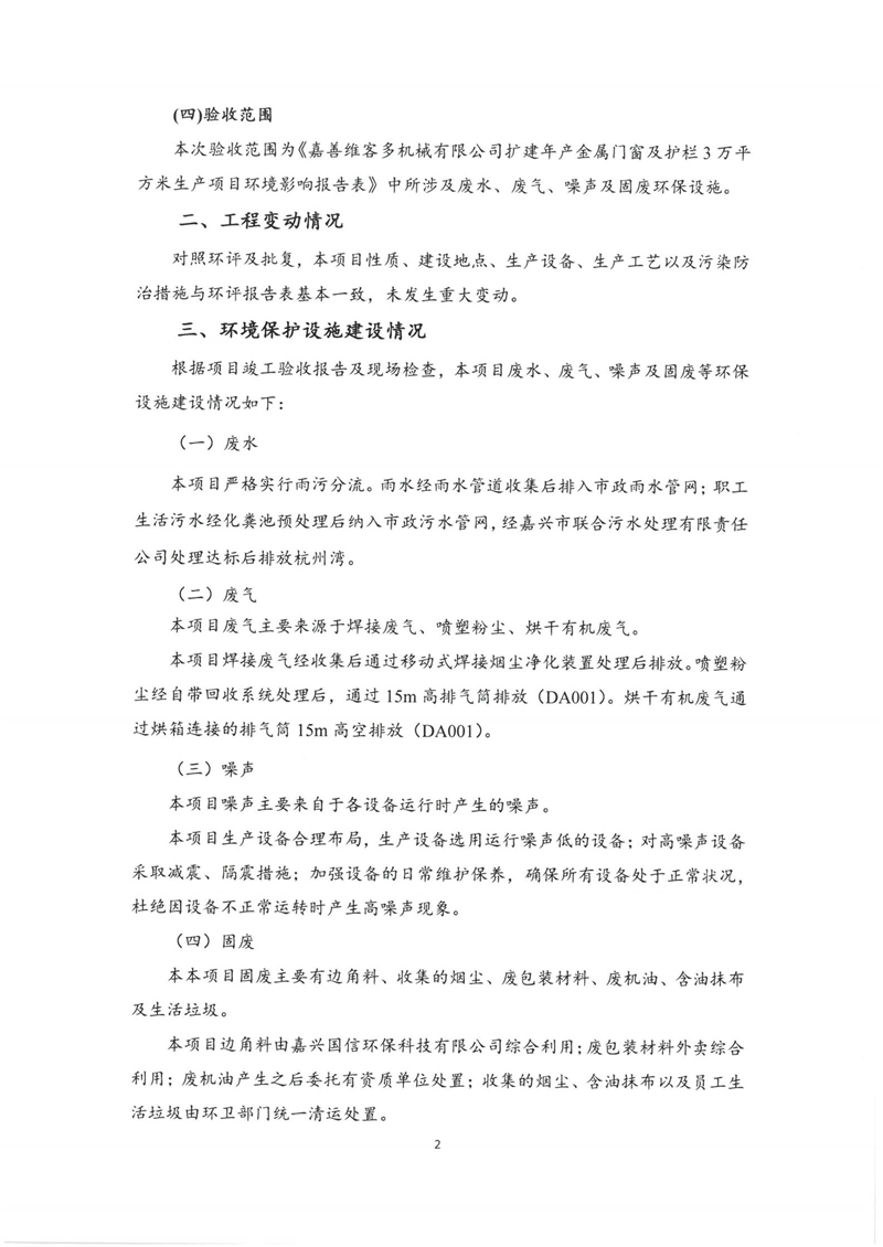 附件下載:嘉善維客多機(jī)械有限公司擴(kuò)建年產(chǎn)金屬門(mén)窗及護(hù)欄3萬(wàn)平方米生產(chǎn)項(xiàng)目自主驗(yàn)收.pdf