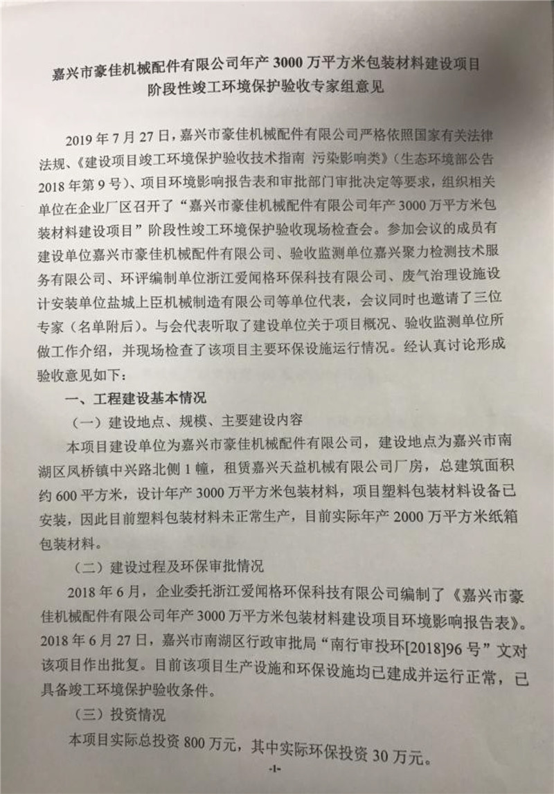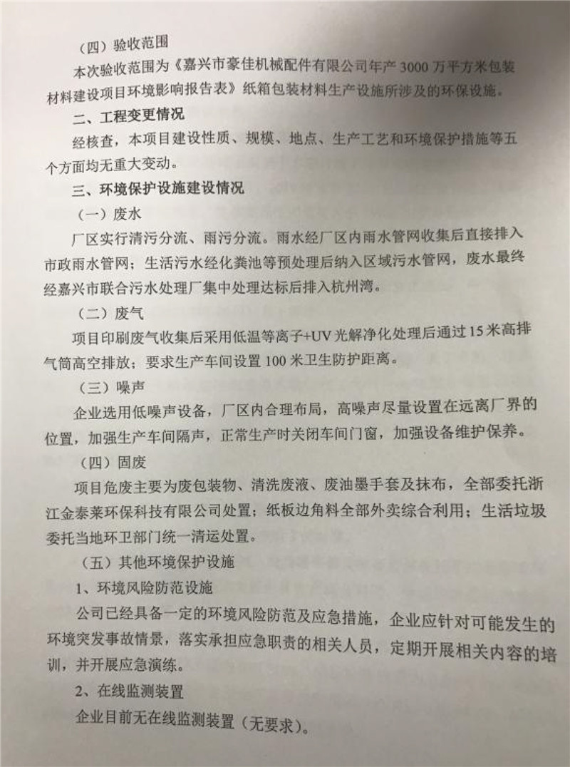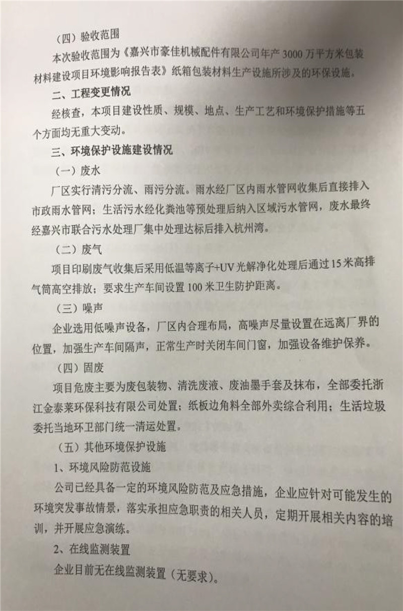 附件下載:嘉興市豪佳機械配件有限公司年產(chǎn)3000萬平方米包裝材料建設(shè)項目(階段性)竣工環(huán)境保護驗收監(jiān)測報告