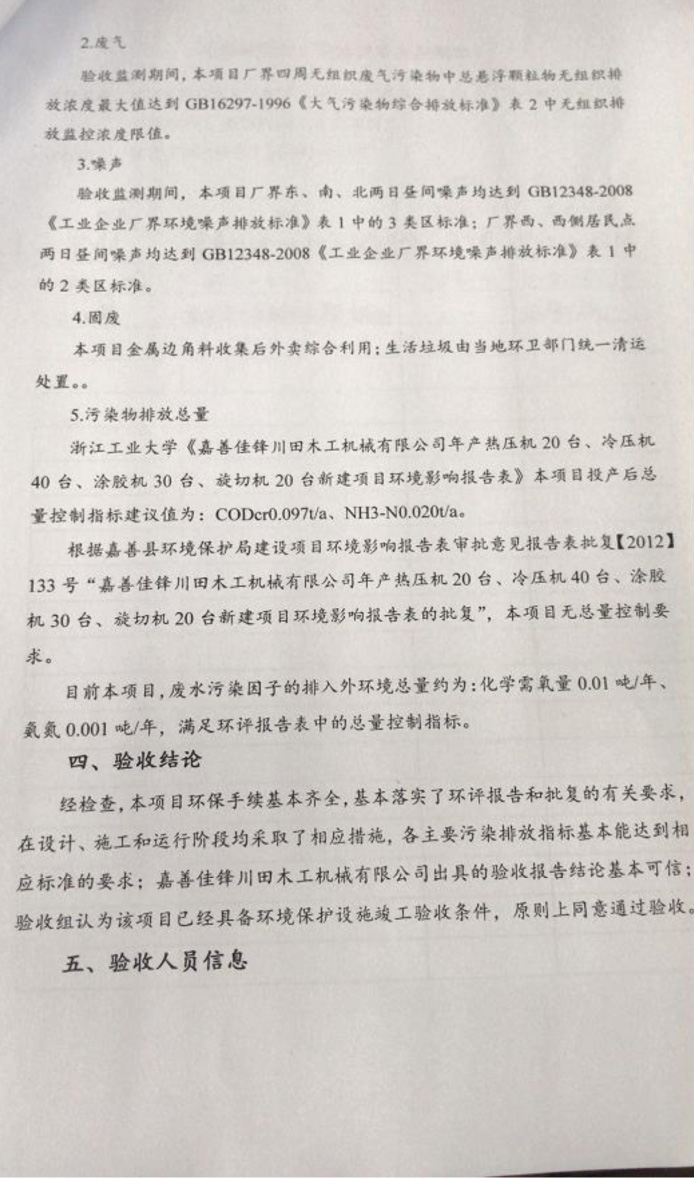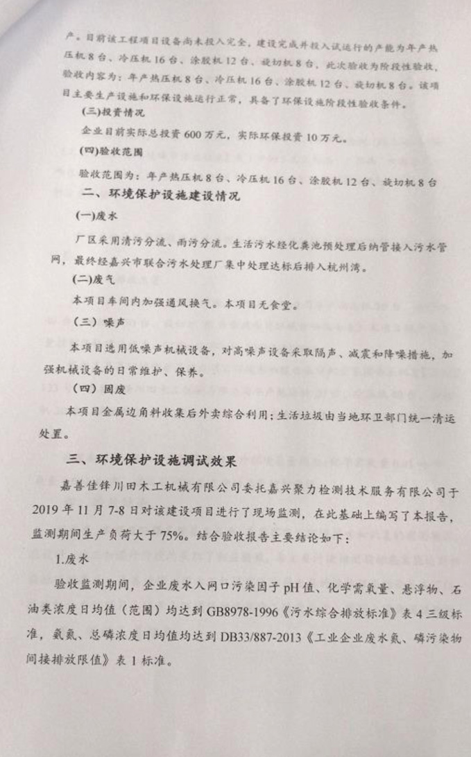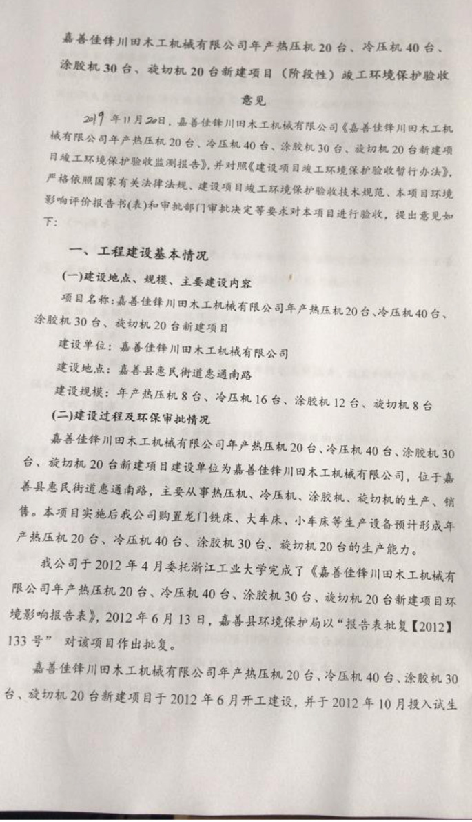 下載地址:嘉善佳鋒川田木工機械有限公司年產(chǎn)熱壓機20臺、冷壓機40臺、涂膠機30臺、旋切機20臺新建項目(階段性)竣工環(huán)境保護驗收監(jiān)測報告
