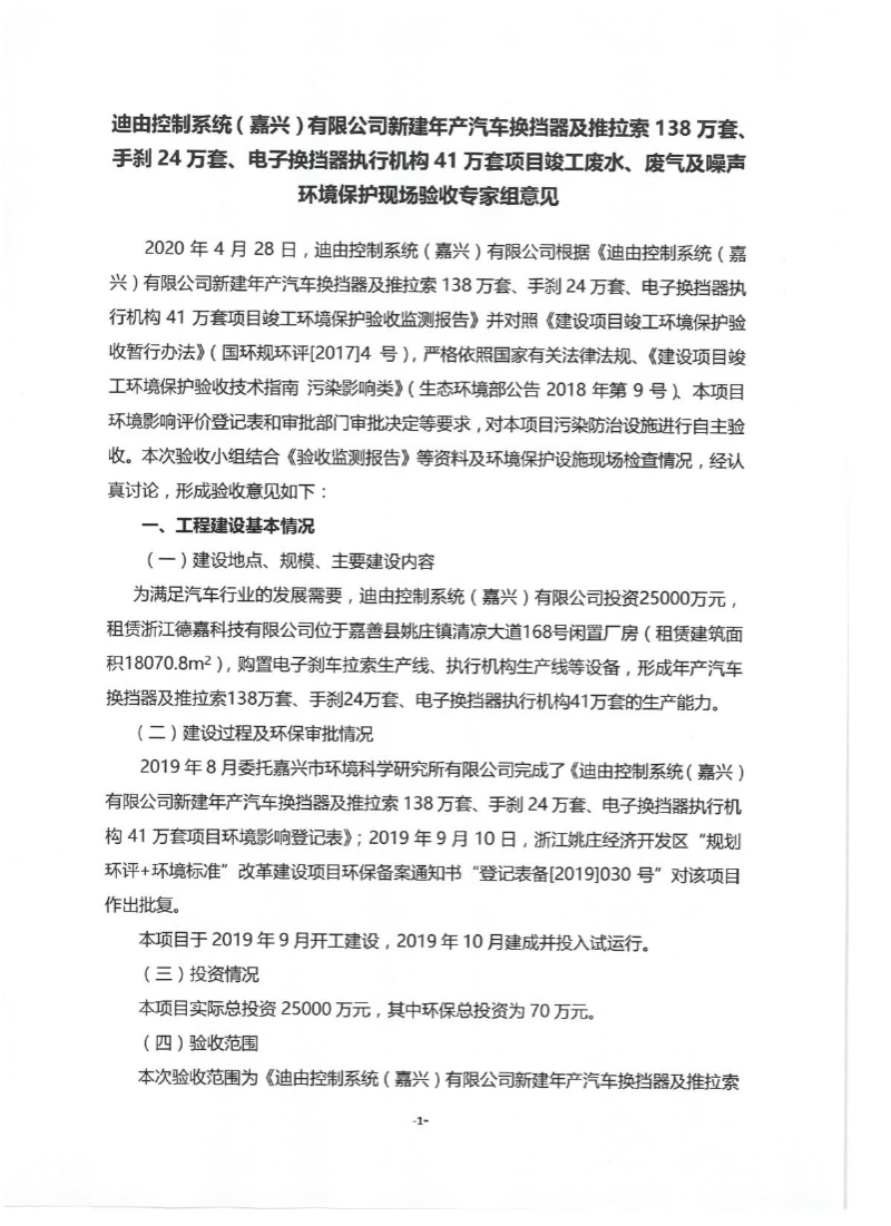 附件下載:迪由控制系統(tǒng)(嘉興)有限公司新建年產(chǎn)汽車換擋器及推拉索138萬套、手剎24萬套、電子換擋器執(zhí)行機(jī)構(gòu)41萬套項(xiàng)目驗(yàn)收?qǐng)?bào)告