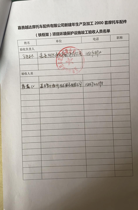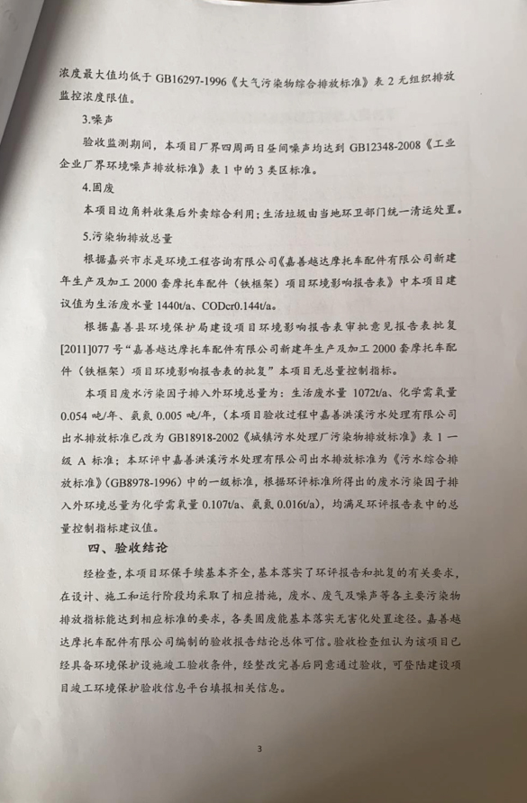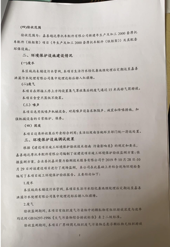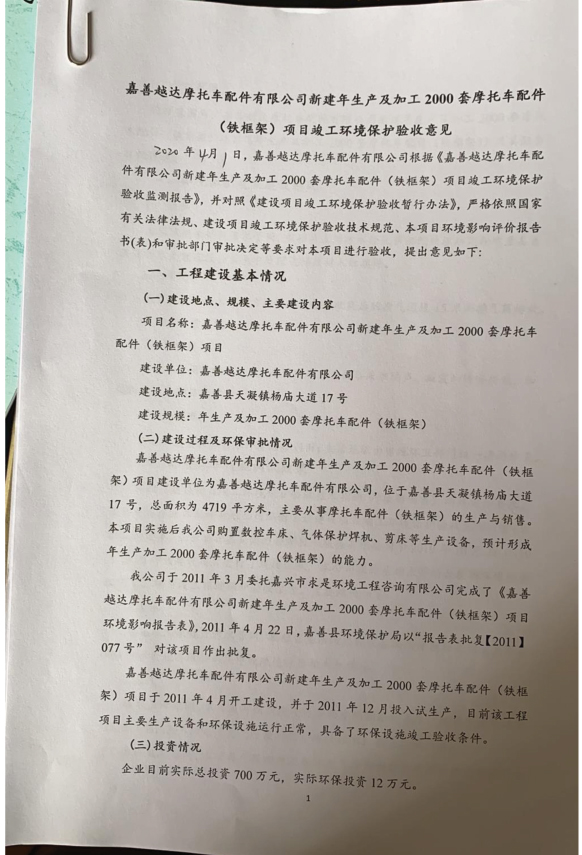 附件:嘉善越達(dá)摩托車配件有限公司新建年生產(chǎn)及加工2000套摩托車配件(鐵框架)項(xiàng)目驗(yàn)收報告