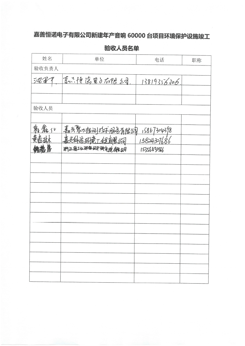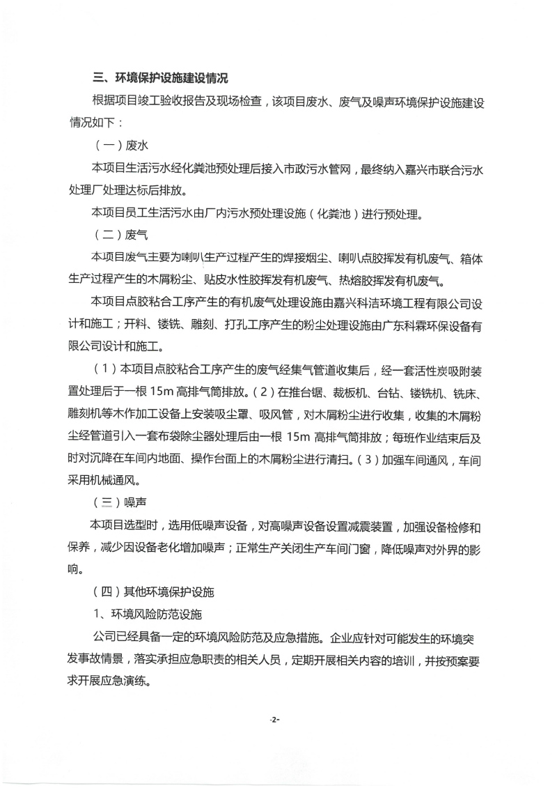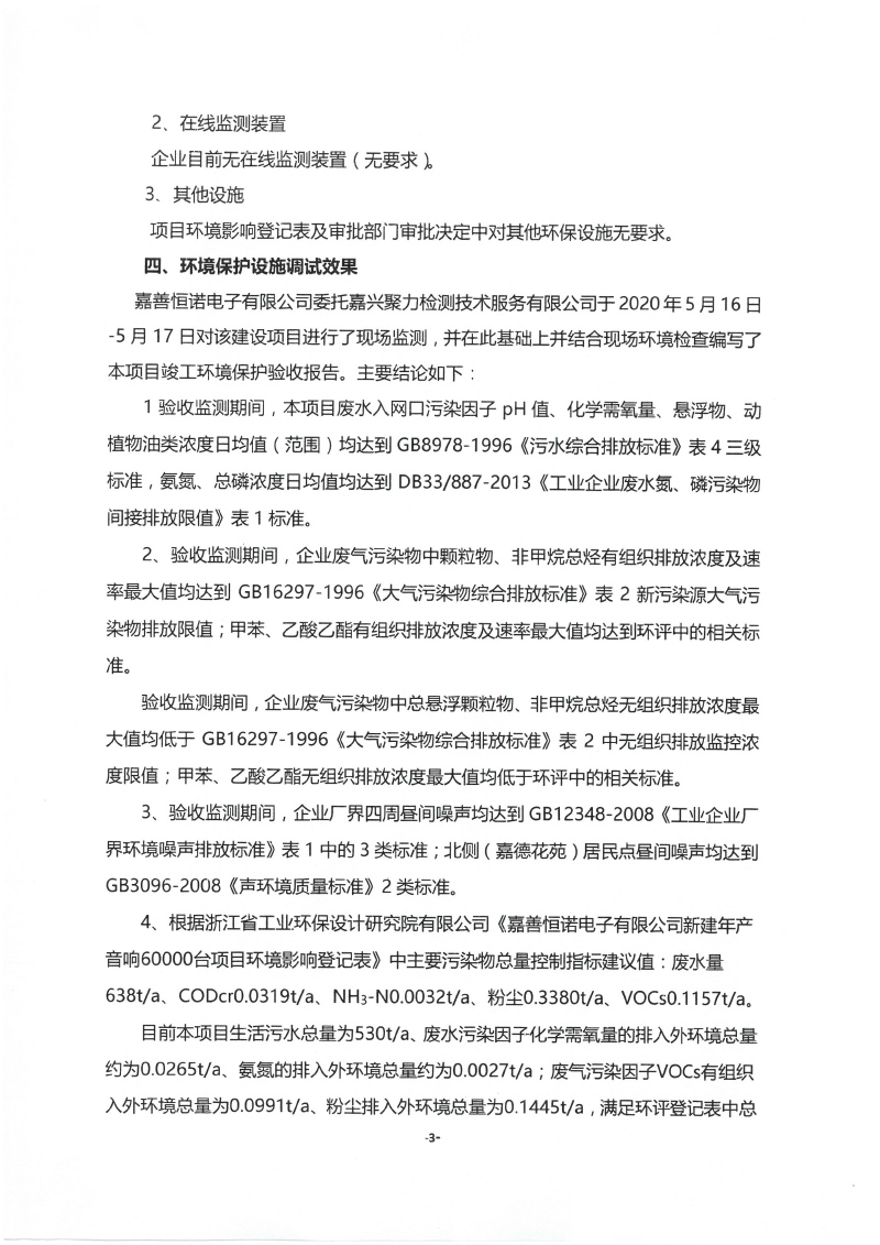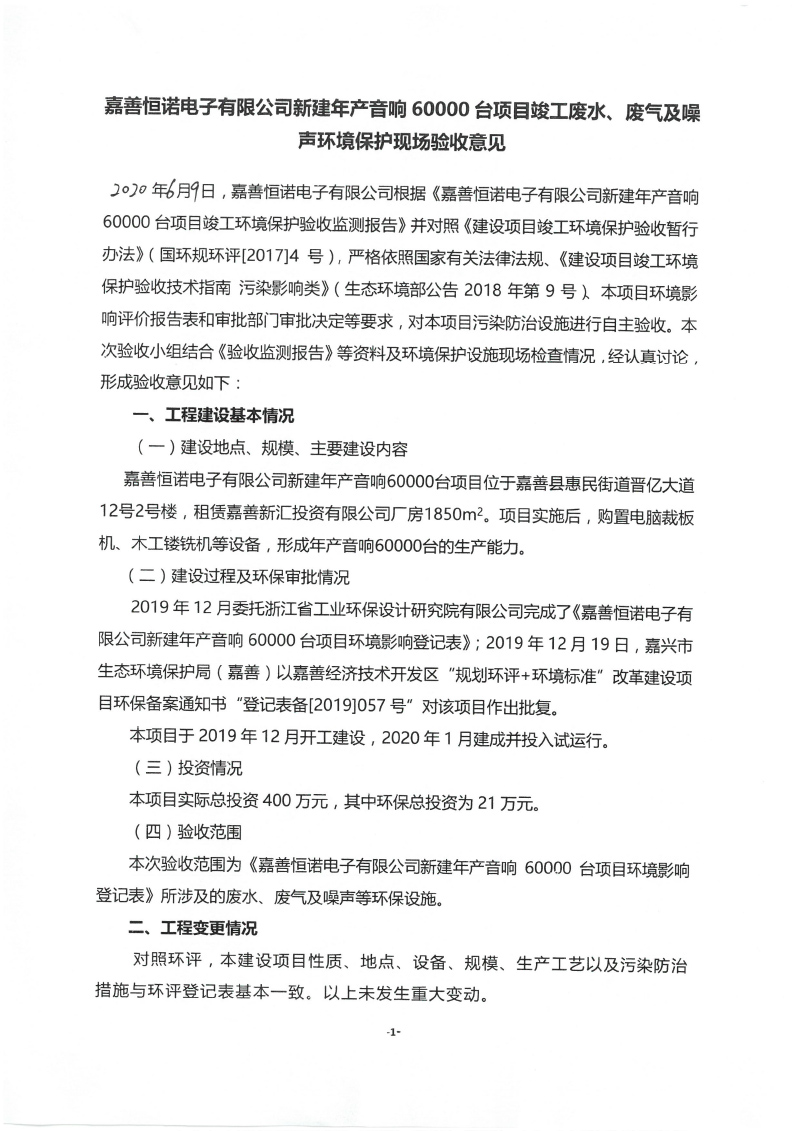 嘉善恒諾電子有限公司新建年產(chǎn)音響60000臺(tái)項(xiàng)目竣工廢水、廢氣及噪聲環(huán)境保護(hù)驗(yàn)收意見(jiàn)